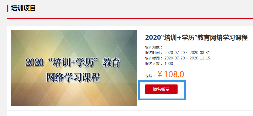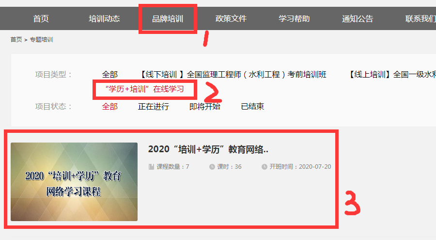 選擇菜單欄中的“品牌項(xiàng)目”,項(xiàng)目類型選擇“‘培訓(xùn)+學(xué)歷’在線學(xué)習(xí)”,找到具體的培訓(xùn)項(xiàng)目