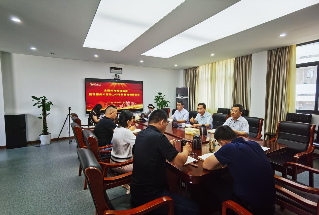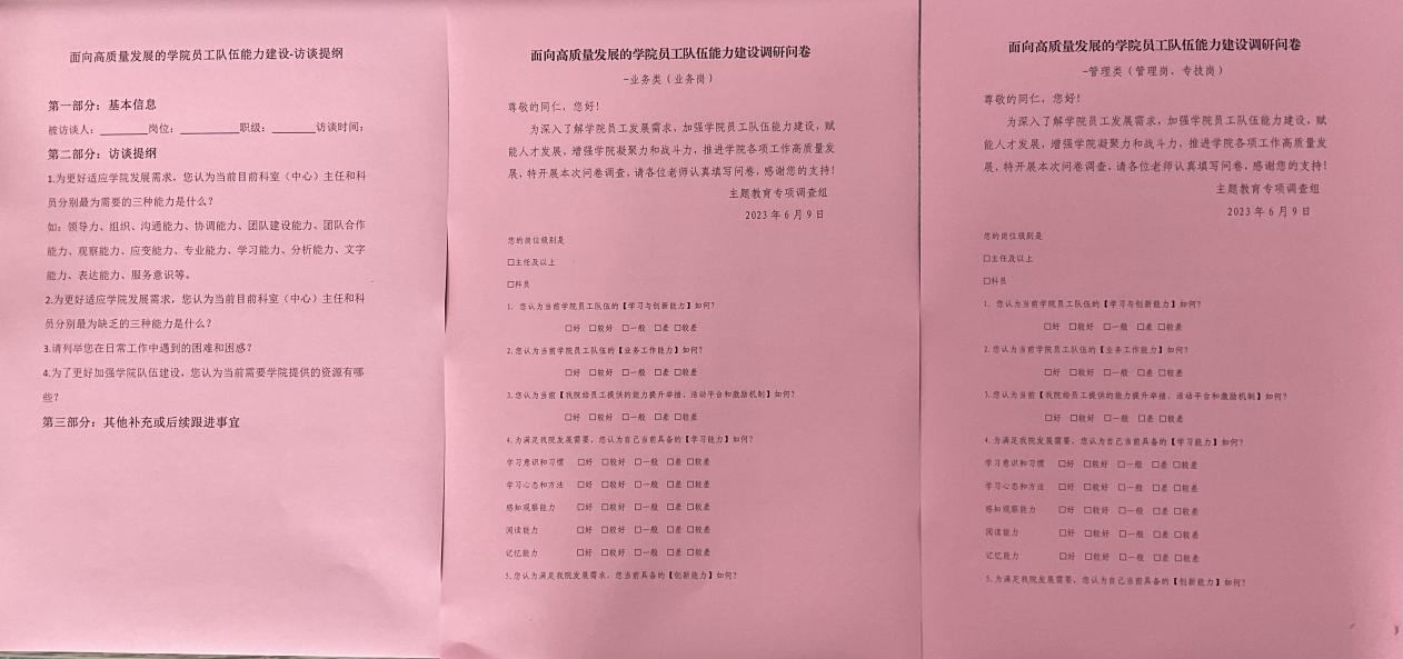 5月12日至6月9日,學院領導班子就三個調研問題進行了院內外、校內外38次調研。學院領導走進學院各科室、校內相關單位和部分校外教學點,通過隨機走訪的集體訪談、個別訪談以及問卷調查的方式,了解院內教職工和教學點工作人員關于學院教職工隊伍能力建設、非學歷培訓和學歷繼續教育發展中存在的問題及其建議。在訪談和問卷調查中,對學院科室(中心)主任和科員、管理、專技崗和業務崗人員分類別和層次設計不同的問題,切中學院高質量發展的堵點和難點。一份份問卷的回收、一場場訪談的舉辦、一次次探討的進行、一個個建言的提出使調研不斷走深走實,取得了實實在在的成效。