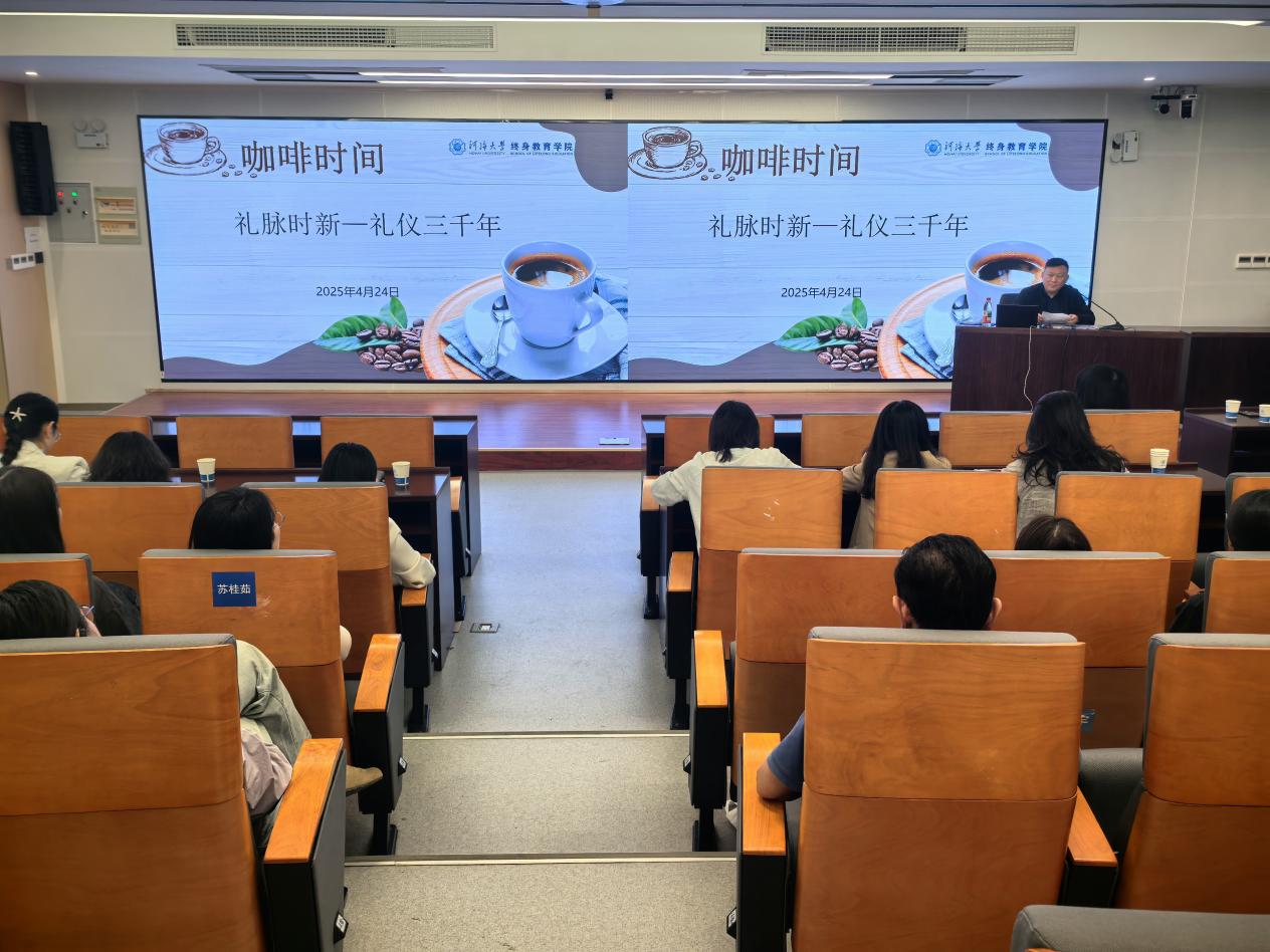 4月24日下午,終身教育學院舉辦本年度第二期“咖啡時間”文化沙龍活動。學院副院長姚文賢以《禮脈時新——禮儀三千年》為題,與40余名教職工在氤氳的咖啡香氣中,共同開啟了一場傳統(tǒng)與現(xiàn)代交融的文明對話。活動由學院黨總支組織委員仲兆宏主持。